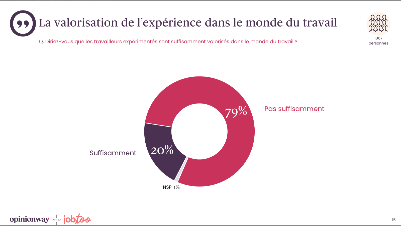 79 % des Français estiment que les salariés ne sont pas assez valorisés dans le monde du travail. Ce jugement est encore plus sévère chez les femmes (85 % d’entre elles le pensent) et chez les 50 ans et plus (84 %), signe que les premiers concernés sont les plus critiques sur le gâchis de talents que représente l’actuelle gestion des fins de carrière.